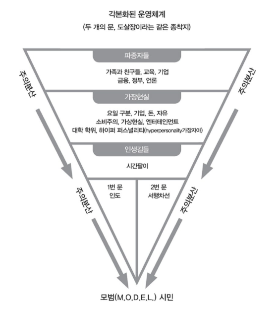 우리 삶은 이런 각본화된 운영체계(삶)를 통해 인도와 서행차선의 두 개의 문, 하나의 도살장(모범시민(M.O.D.E.L))이라는 종착지를 향하게 프로그램되어있다.